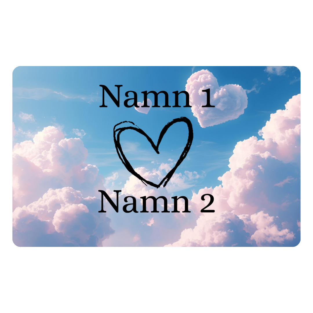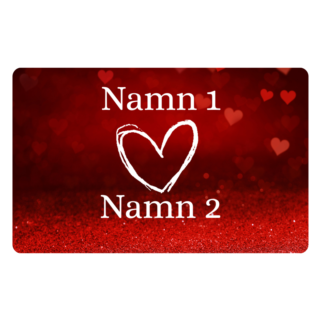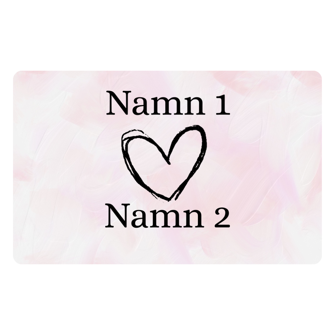 Skapa ett personligt Alla hjärtans dags-kort med ett stilrent hjärta och två valfria namn. Kortet anpassas med Namn 1 och Namn 2, vilket gör det till en personlig och betydelsefull present till någon du tycker om.