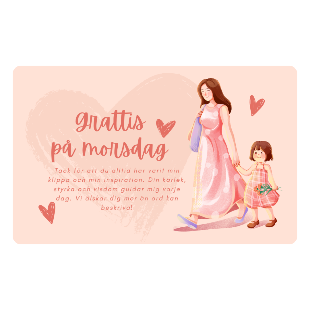 Kortet har texten “Grattis på Mors dag” tillsammans med en hjärtlig och varm hälsning fylld med ord om kärlek, omtanke och uppskattning.