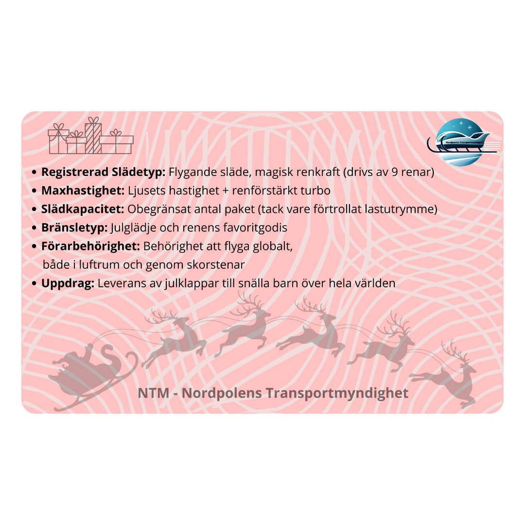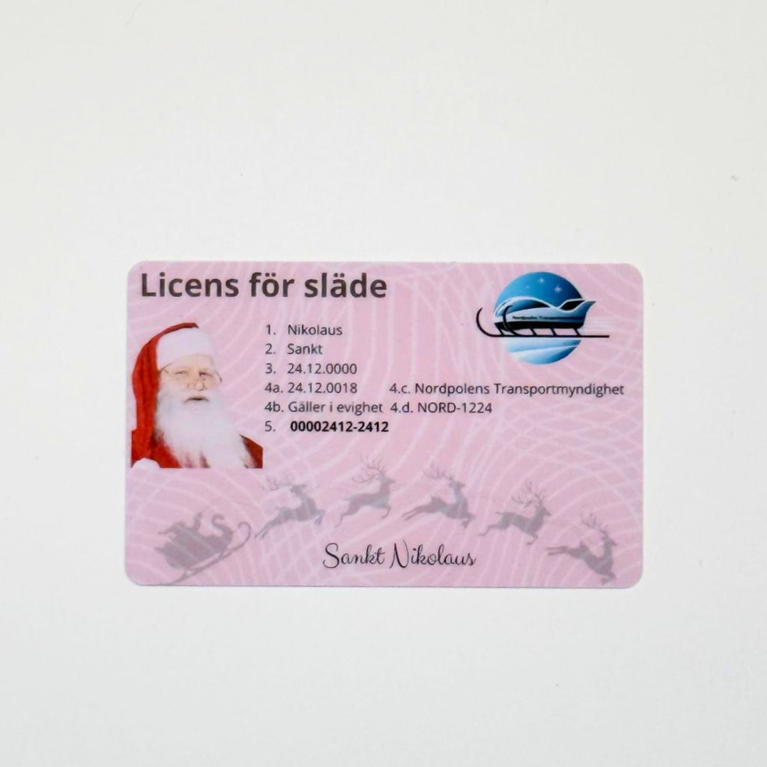 Kortet är tillverkat i slitstark, glansig plast med en vacker, detaljrik juldesign, vilket gör att det känns som en riktig biljett till Tomtens släde.